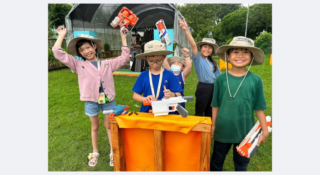 Through simple tasks - dismantling pellets to build fences, upholstering chairs, sawing and drilling wood for flooring and structures like balance beams, slides and swings - I realised how much depth lay behind what seemed simple. We repurposed recycled materials creatively: plastic scraps and bottles as ecobricks, MRT poles for chin up bars and swings, tires for hills and seating, pallets for blaster game obstacles. This process rekindled a childlike sense of curiosity and exploration- free from expectations, just hands in the dirt, asking questions, learning from the ground up.