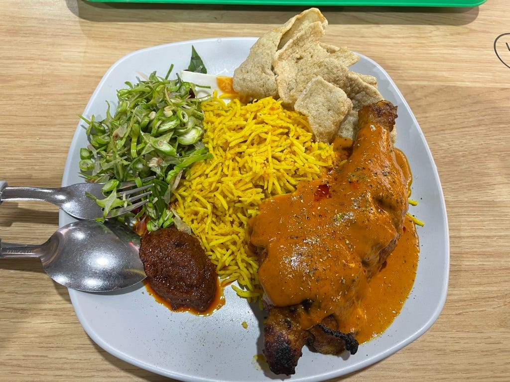 Kerabu, a hawker stall run by a former fine-dining chef, serving up a traditional plate of turmeric rice with smoky, coconut-husk-grilled meats and a refreshing salad (winged bean, pomegranate, pomelo) at Yishun Park Hawker Centre.